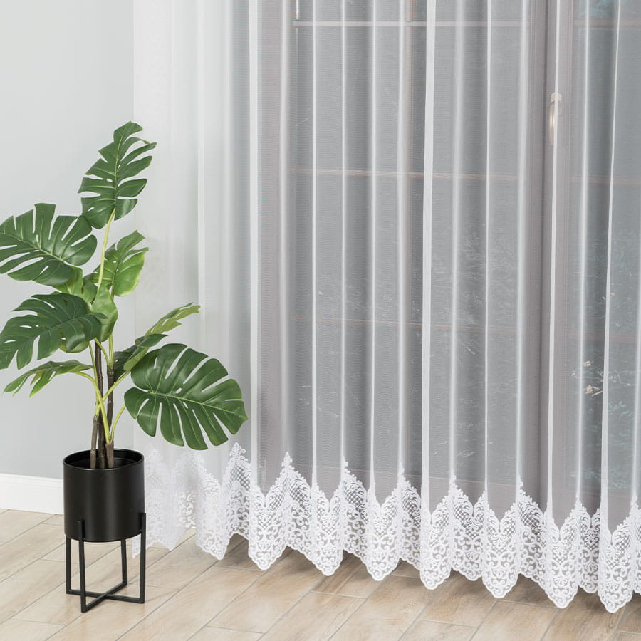 Ta wyjątkowa firana to doskonały wybór dla osób ceniących delikatne detale i eleganckie wykończenia. Wykonana z najwyższej jakości tiulu, jest niezwykle lekka, zwiewna i półprzepuszczająca, dzięki czemu wpuszcza do wnętrza dużo naturalnego światła, nadając mu jasność i świeżość. Dolną część firany zdobi subtelny haft wzbogacony metalizującą nitką, która delikatnie mieni się w świetle, podkreślając elegancki charakter dekoracji. Taki detal sprawia, że firana nabiera wyjątkowego uroku i staje się efektownym elementem aranżacji okiennej. Uniwersalny charakter sprawia, że doskonale komponuje się zarówno z wnętrzami klasycznymi, jak i nowoczesnymi. To ponadczasowa dekoracja, która doda romantyzmu i lekkości każdemu pomieszczeniu – od salonu i sypialni, po jadalnię czy elegancki gabinet.