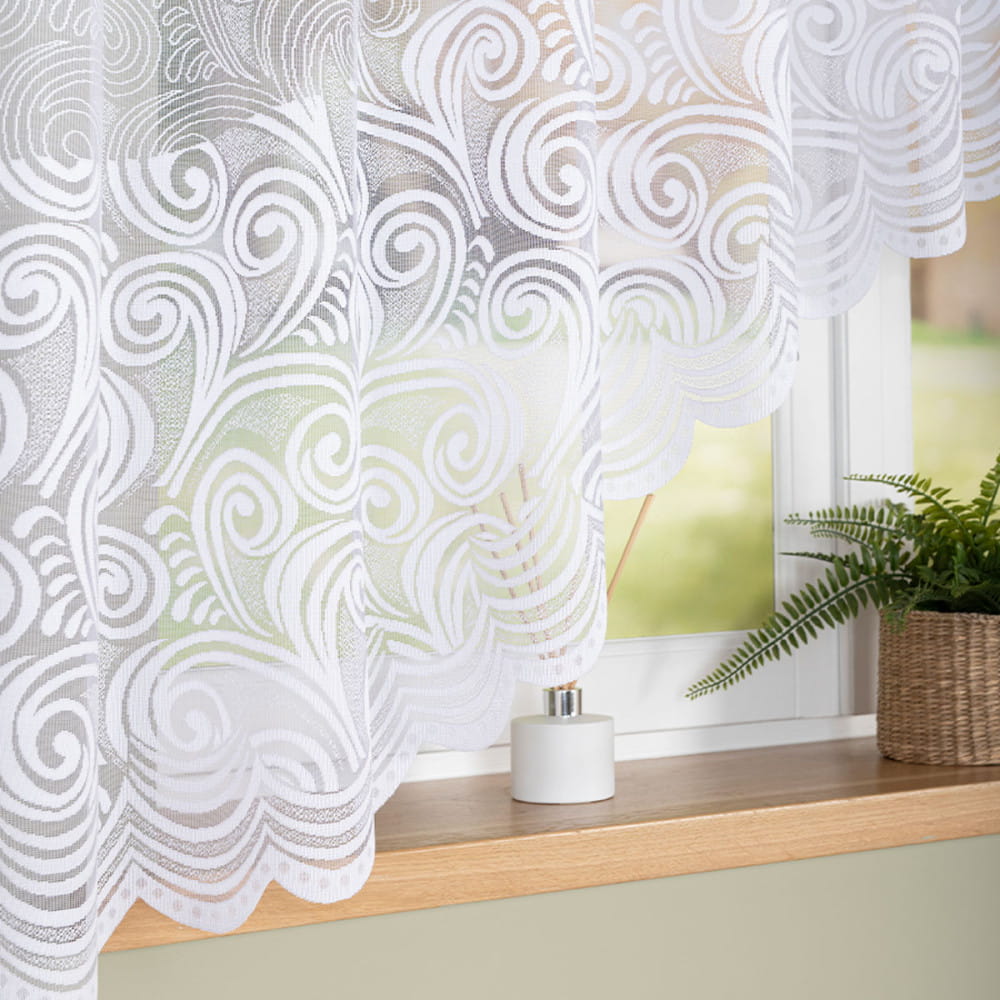 Ta firana to synonim klasycznej elegancji i lekkości. Subtelne wzornictwo w połączeniu z ozdobnym wykończeniem w łuk tworzy ponadczasową dekorację, która upiększy każde wnętrze, nadając mu stylu, delikatności i świeżości.