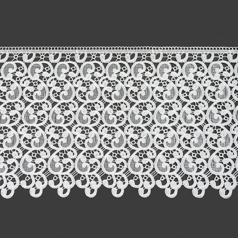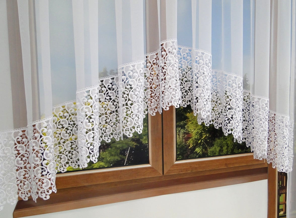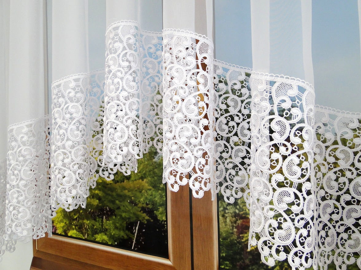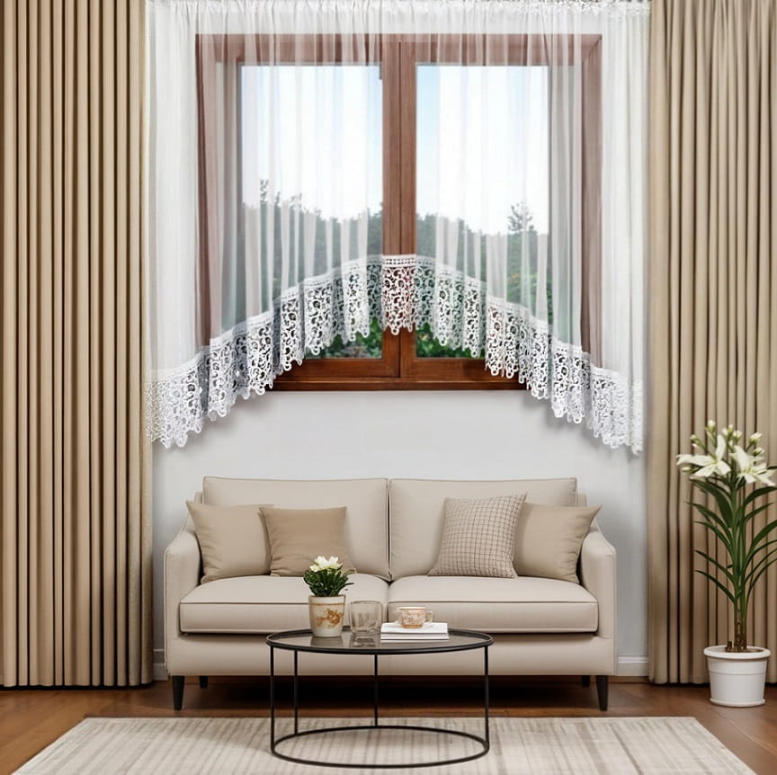Elegancka gipiura – nadaje firanie wyjątkowy, dekoracyjny charakter.