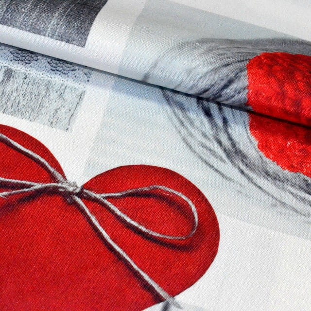 Elegancki nadruk: czerwone serca i motyw gazety w szarościach.