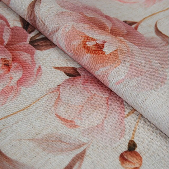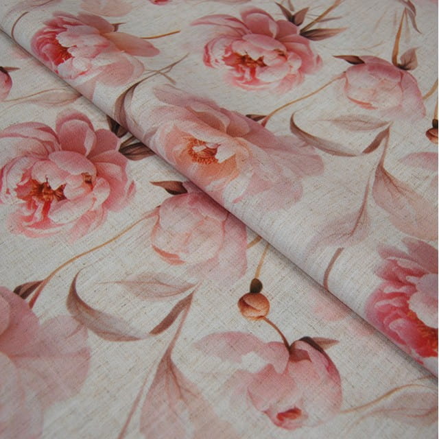 Lnianopodobna tkanina zasłonowa i obrusowa z motywem piwonii – elegancja i naturalny urok w Twoim wnętrzu.