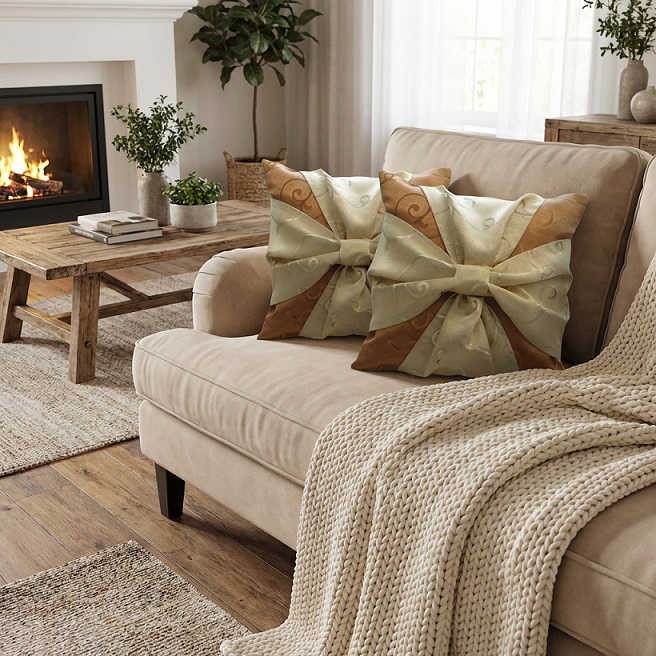 Poszewka dekoracyjna 40 × 40 cm brąz ze złotem z kokardą – tkanina Liana